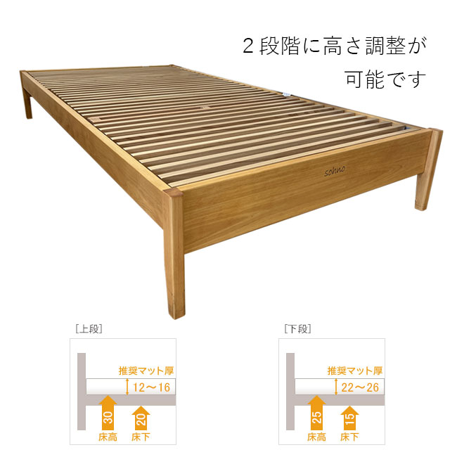 国産のヒノキ無垢材を贅沢に使ったヘッドレスベッドフレーム。 ヘッドボードが無く床板が2段階に調整できるデザインですので、どんなお部屋にもスッキリと納まります。敷きふとんや薄めのマットレスから厚いベッドマットレスまで乗せることができます。 ヒノキ特有の心地よい香りがお部屋に安らぎをもたらしてくれます。 すのこは全て「加賀杉」の無垢材を使っていますので、湿気が上手に逃げカビ防止になりますよ。加賀杉の角材を縦に並べ強度をUPしています。 国産無垢材の上質なベッドをお探しの方におすすめです。 石川県産の上質なヒノキ無垢材を贅沢に使った、シンプルで上品なベッドフレームです。 ヒノキ特有の香りが寝室に安らぎを与えてくれます。 石川県産ヒノキは耐久性と耐熱性に優れており、防虫効果もあります。 ※天然木は、色味・木目・香りに個体差があります。ご承知ください。 “木材の表面の削って「極限まで滑らかにする」加工方法” 研磨ではなく切削であるこの工程は、かなり職人的で熟練の技術が必要です。 カンナの様な超仕上げ機を使って木材の表面を滑らかに仕上げ、製品の格を一段上げます。すべすべの触り心地をお楽しみください。 片方を凸(ホゾ)、もう片方を凹(ホゾ穴)に加工し組み合わせる技法で、接着剤を使わなくても強度が出ます。 日本建築で古くから使われている技法で、手間と技術が必要な職人技です。引っ張りやねじれに非常に強く、高い耐久性が期待できます。 スノコは全て加賀杉の無垢材を使用しています。 平らな板ではなく角材を縦に並べ強度をUP。見た目にも非常に美しいすのこになっています。 床面高は2段階に調整可能。30cm、25cm、お使いのおふとんマットレスの厚さに合わせて、高さ調整をしてください。 10cm前後の三つ折りマットレスや20cm前後のベッドマットレスもお使い頂けます。 シングル W1020xL2060xH300mm 石川県産ヒノキ無垢材 / 加賀杉スノコ オイル塗装(チェリー色) 上段(30cm) 206cm 日本製(石川県加賀市) S・SD:約10日間、D・Q・SS:受注生産 1ヶ月