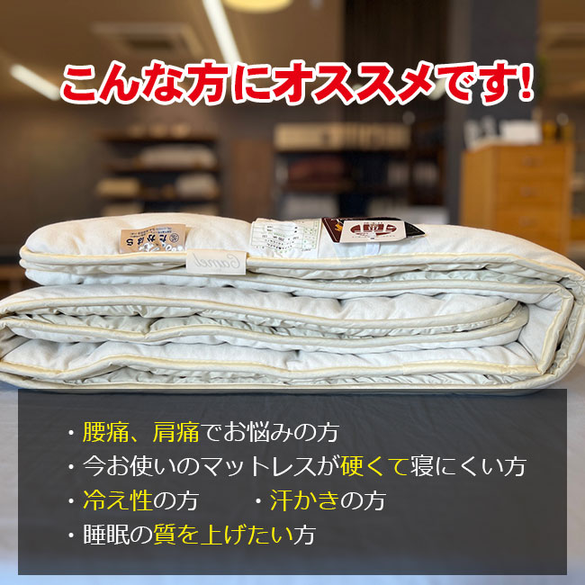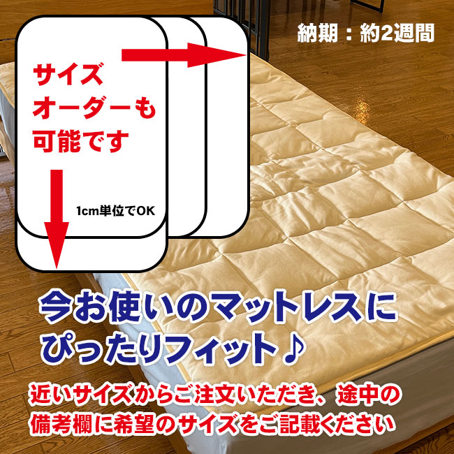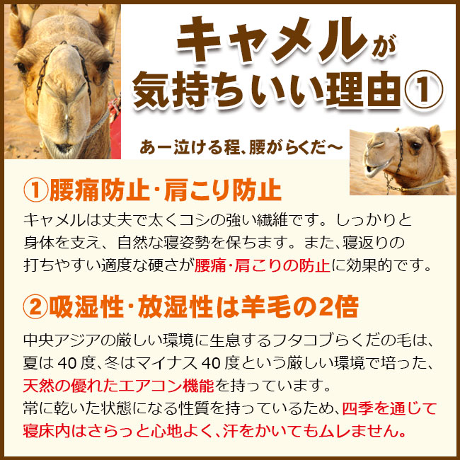 「キャメルの良さをもっと多くの方に知って欲しい」という想いで作り上げた、睡眠ハウスたかはらオリジナルのキャメルベッドパッド。 羊毛(ウール)の2倍の吸湿性、コシのある寝心地、抜群の吸湿発散性、寝具に必要な要素が全て詰まった高品質なベッドパッドです。 7~10万円もするメーカー品と比べると、半額以下の価格でお買い求め頂けます。(メーカー品が高すぎるともいえます) 1cm単位でサイズオーダー可能ですので、お気軽にご相談くださいませ。 睡眠ハウスたかはら独自規格。 島根県、出雲大社のすぐそばの寝具専門工場で、職人さんが丁寧に作っています。 中央アジアの過酷な気候に適応するための、フタコブらくだの毛。 通気性・へたりにくさ・放湿性、全てに優れています。 ウールの1000分の1の希少性。 表裏で側生地を変えています。 お好みに応じて使い分けいただけます。 寝返りがしやすいので、腰痛や肩痛でお悩みの方にも最適です。 吸湿性、放湿性は天然のエアコンと呼ばれるウールの2倍。四季を通じて寝床内気候を快適に保ってくれます。 羊毛と比べてフェルト化しにくいので、へたりに強い特徴があります。 軽いのでふとん干しも楽ですよ! 高品質なキャメルの良さを、リーズナブルな価格でご提案します。 1cm単位でサイズオーダー可能 どんなサイズでも短納期でお作りすることができます。 ・腰痛、肩痛でお悩みの方 ・冷え性でお悩みの方 ・今お使いのマットレスの寝心地が悪い方 ・睡眠の質を上げたい方 シングル W1000xL2000mm 中綿量 1.2kg 詰め物 キャメル(らくだ)100% S:1~2日、SD以上:約10日~2週間 日本製(出雲)