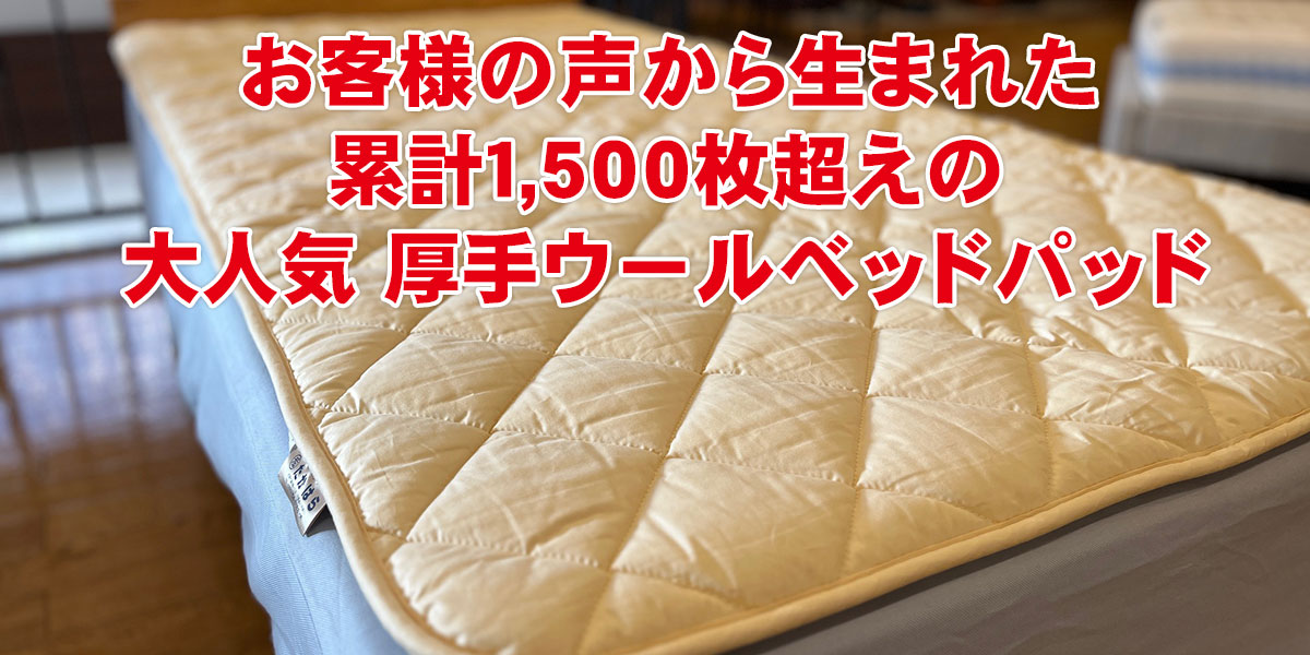 「もっとしっかりした厚いベッドパッドはないかしら」というお客様の声から生まれた、睡眠ハウスたかはらオリジナルの「厚手二層式羊毛ベッドパッド」。 厚さは約4cm。羊毛のシート層を二層にし厚みを出してあるので、ウールに包まれる感じでゆったりとお休み頂けます。 累計1500枚を突破した当店で最も売れているベッドパッドです。お値段がリーズナブルなのも嬉しい点。 1cm単位でサイズオーダー可能ですので、お好みのサイズでお作り致します。 ペラペラのベッドパッドでは物足りない、厚手でふかふかした寝心地をお求めの方用のベッドパッド。 睡眠ハウスたかはらオリジナルです。 お客様の声から生まれたベッドパッド。 ふかふかな寝心地で幸せな気分で眠れますよ! 累計販売枚数1500枚突破! 出雲大社のすぐそば、1万㎡を超える大きな寝具工場で、職人さんが丁寧に作っています。 羊毛シート層を二層にして、しっかりと厚みを出しました。 へたりに強いので長年お使いいただけます。 なんと厚さは約4cm! 中綿のウールは、シングルサイズで2.0kg入っています。 よくあるベッドパッドは、0.5kg~1.0kgですので、2~4倍の厚みがあります。 ウールは天然のエアコン 夏は汗をしっかり吸収発散してくれますので蒸れ知らず。 年中使えるオールシーズン対応です。 1cm単位でサイズオーダー可能 どんなサイズでも短納期でお作りすることができます。 こちらの羊毛ベッドパッドはこんな方におすすめ。 今お使いのマットレスが硬くて、腰が痛い方。寝心地を変えたい方。 冷え性、寒がりの方。 人にやさしいウールには魅力がいっぱい! 天然のエアコンと言われる「調湿機能」、寒い冬には抜群の「保温力」。 優れた「リラクゼーション効果」もあります。 シングル W1000xL2000mm 中綿量 2.0kg 詰め物 ウール(羊毛)100% スチーム&ドライ加工 S~D:1~2日、WD以上:約10日~2週間 日本製(出雲)